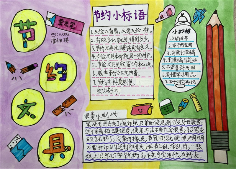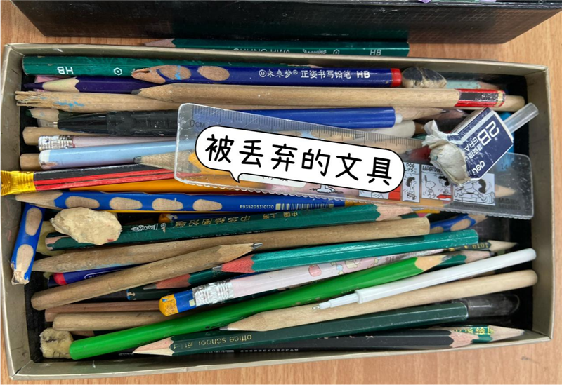 孩子们时常和各类文具打交道,面对着各式各样的文具,孩子们感到又新鲜又觉得有趣。可时间一长,就出现了一些不爱惜的现象,丢掉的橡皮随处可见,铅笔没有用完就买新的,旧文具被丢弃在一边,购买文具不重视实用而在意“好不好看”……为了让孩子们养成爱惜文具的好习惯,我们倡导:文具盒里的文具够用即可,不浪费;笔记本等实用为主,不攀比;纸张要尽量双面使用;橡皮不要随意丢弃;书皮等不妨循环使用。