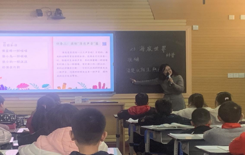 张茜老师执教三年级下册《海底世界》,张老师以“做有声图书馆小主播”这一大任务贯穿整个教学,学生的学习兴趣一下子就被激发出来了。学生在完成“‘揭秘海底’目录”“录制‘海底光线’篇”“录制‘海底声音’篇”三个微任务的过程中,既认识了科普读物,又掌握了语言与科学知识,还增强了读科普读物的兴趣,收获满满。