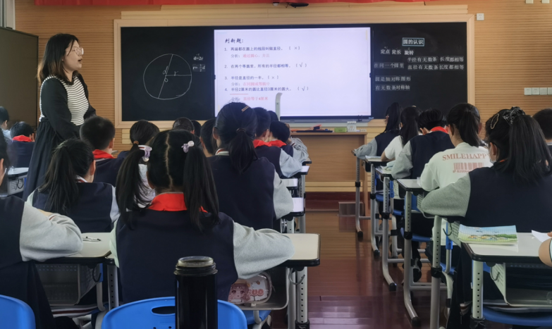 张慜喆老师执教五年级下册《圆的认识》,张老师以生活中的圆引入,引导学生与之前的平面图形进行对比,突出圆的特点,通过动手实践掌握圆的各部分名称及特征,在折一折、画一画、量一量等活动中形成对圆的认识。